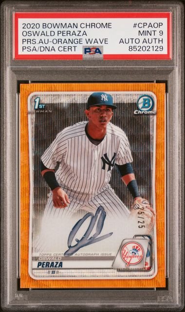 2020 Topps Bowman Chrome – Oswald Peraza CPAOP – Orange Wave 25/25 – PSA Mint 9