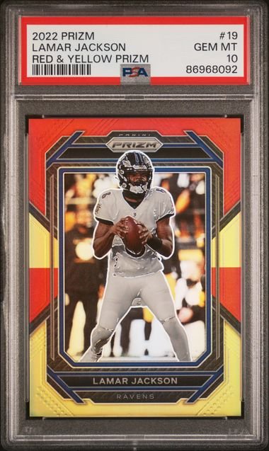2022 Panini Prizm – Lamar Jackson 19 – Red & Yellow Prizm /44 – PSA 10