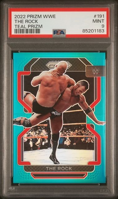 2022 Panini Prizm WWE The Rock 191 Teal /49 – PSA 9