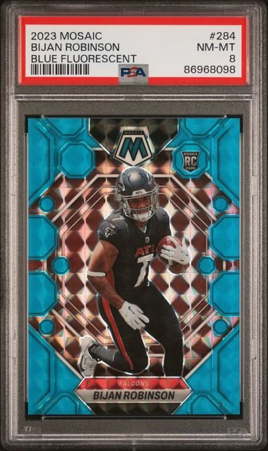 2023 Panini Mosaic – Bijan Robinson 284 – Blue Fluorescent /15 – PSA NM-MT 8