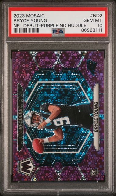 2023 Panini Mosaic – Bryce Young ND-2 – NFL Debut Purple No Huddle /50 – PSA Gem Mint 10
