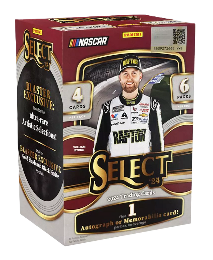 Panini presents the 2024 NASCAR Select Auto Racing Trading Card Blaster Box. Each box contains 6 packs with 4 cards per pack. Look for an Autograph or Memorabilia card! Look for the Ultra-Rare Arti…