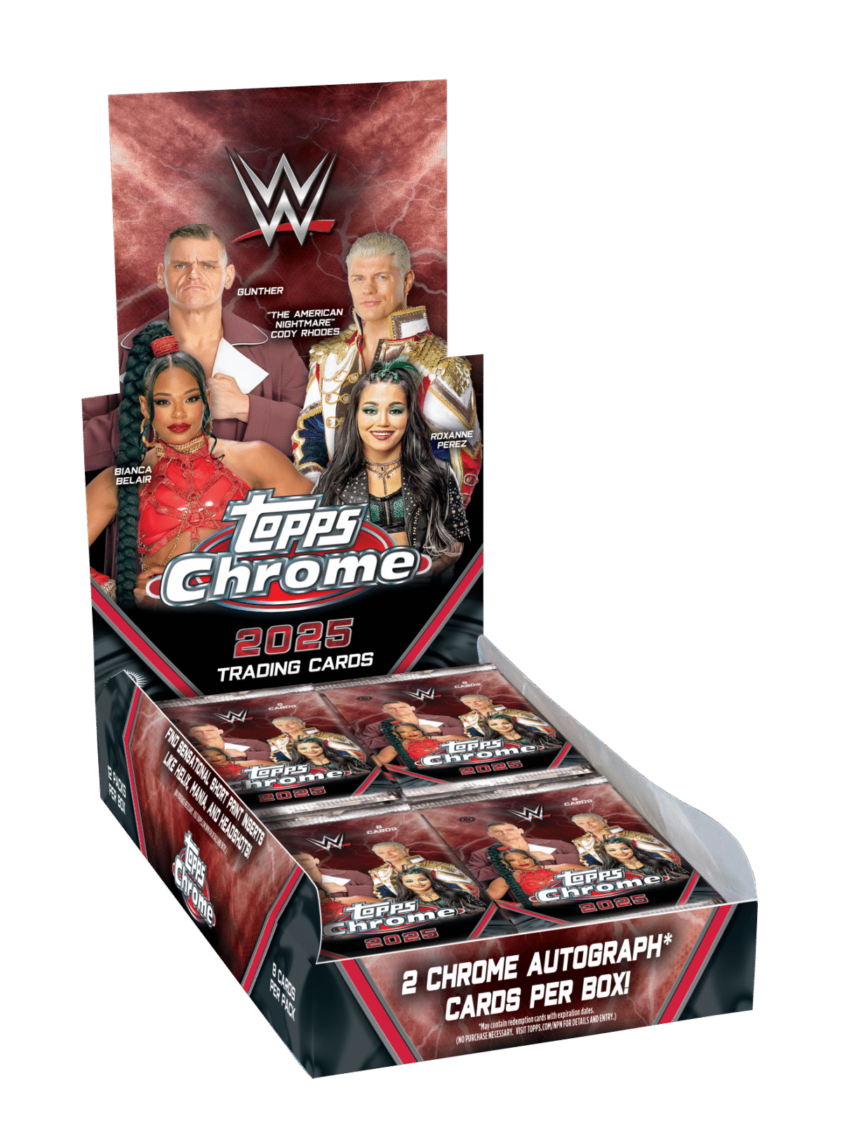 Topps Chrome WWE makes its triumphant return in 2025! Highlighted by a 200-card base set, Chrome WWE will offer parallels to unwrap, as well as Autographs and Chase Inserts to look for!