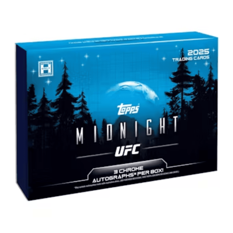 The 2025 Topps Midnight UFC Hobby Box returns on August 8, 2025, offering a striking nighttime aesthetic and premium hit content in each 1‑pack box (7 cards per pack). Every box delivers three autograph cards, including one Rookie Relic Autograph, plus two base parallels, one insert, and one base card. The 100‑card base set features current UFC stars and breakout talent, with nine parallel tiers ranging from Zodiac and Morning (numbered to 125) down to the ultra‑rare Black Light 1-of-1. Insert sets include Nightfall, Lunar Tide, Constellations, The One and Only, and the all-new Insomnia, along with case-hit inserts like Dream Chasers, Greetings From, and Night Vision.