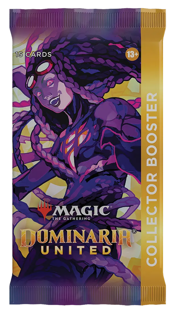 The Dominaria United Collector Booster Pack contains 15 Magic: The Gathering cards and 1 Traditional Foil double-sided token, with a combination of 5–6 cards of rarity Rare or higher and 4–5 Uncomm…