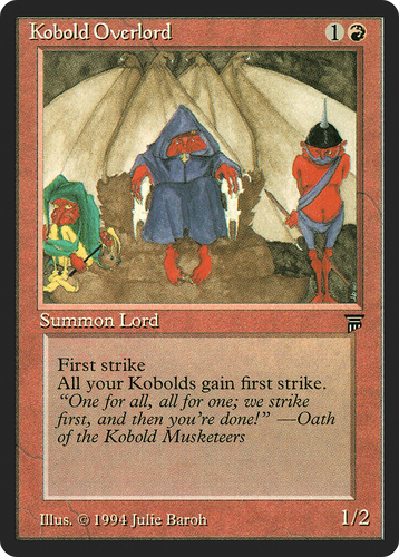 First strike. All your Kobolds gain first strike. Rarity:R Card Type:Creature Lord P / T:1 / 2 Casting Cost:1R Artist:Julie Baroh