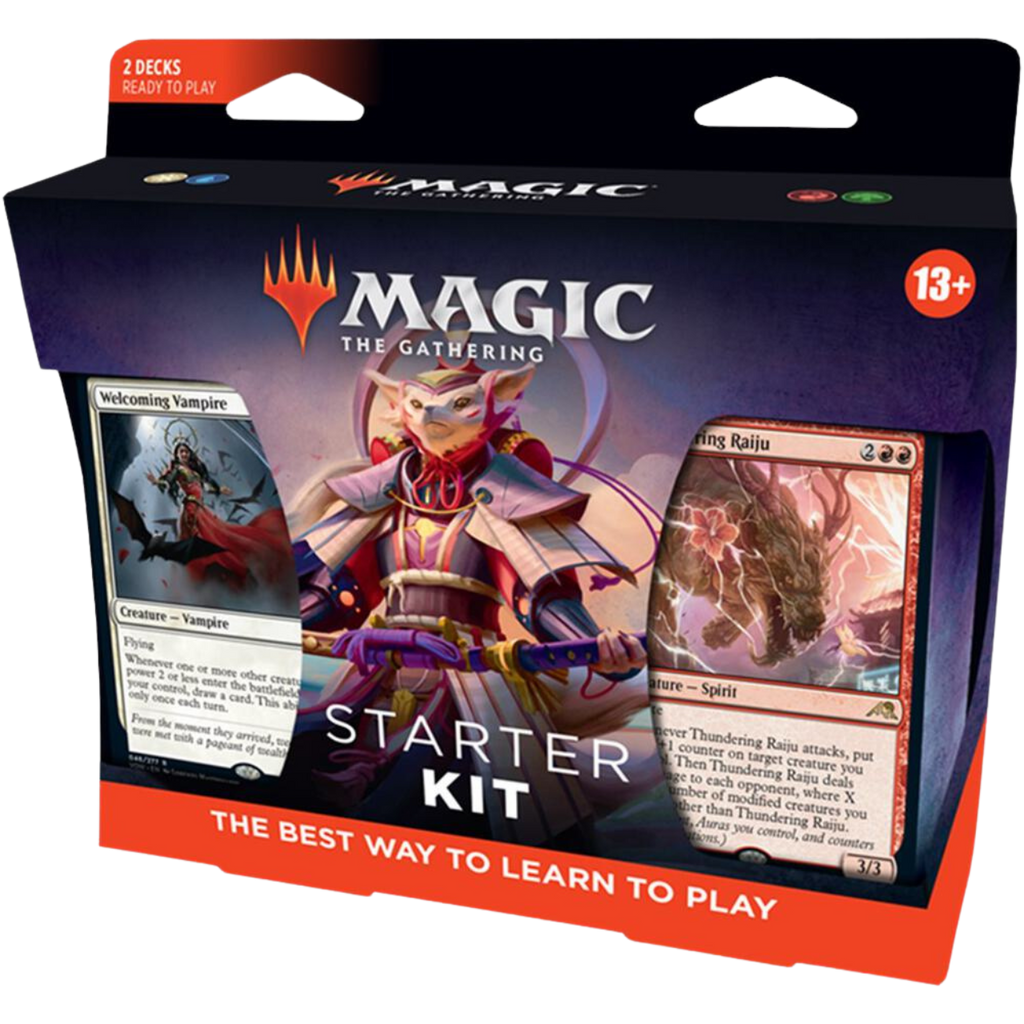 The 2022 Starter Kit is ideal for any pair of new Magic players that walk through your doors, as they give newcomers the opportunity to dive into their first game in-person and continue the fun online with redeemable Magic: The Gathering Arena code cards.Starter Kits are being refreshed for 2022 and will collect cards from Innistrad: Midnight Hunt, Innistrad: Crimson Vow, Kamigawa: Neon Dynasty, and Streets of New Capenna.Contents:• two (2) sixty-card decks (including 2 outward facing foils)• two (2) Reference cards• one (1) Arena variable code card• one (1) Arena insert• one (1) Rules & World of Magic booklet• two (2) Tuck boxes for decks• one (1) Foil Set Up box