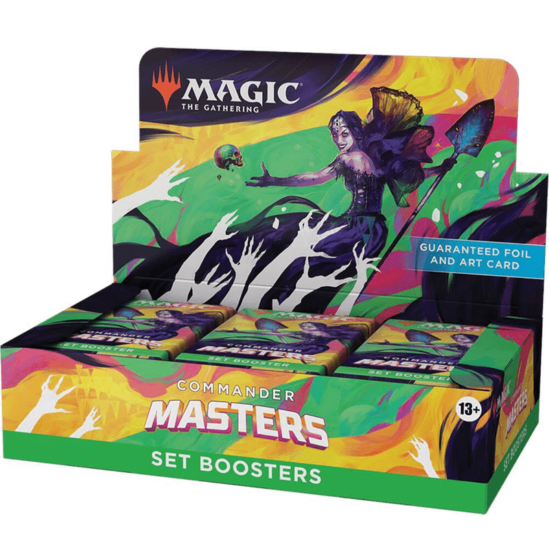 This Commander Masters Set Booster Box contains 24 Commander Masters Set Boosters. Each Set Booster contains 15 Magic cards, 1 Art Card, and 1 token/ad card or card from “The List” (a special card from Magic’s history—found in 25% of packs), including 2–6 cards of rarity Rare or higher (2: 34%; 3: 48%; 4: 15%; 5: 2%; 6: <1%) and 3–8 Uncommon, 4–8 Common, and 1 Land cards. Every pack contains at least 1 Traditional Foil card of any rarity. A Traditional Foil Land replaces the basic land in 20% of Set Boosters and a Foil-Stamped Signature Art Card replaces the Art Card in 10% of Set Boosters. A Traditional Foil Borderless Mythic Rare card can be found in 1% of boosters.