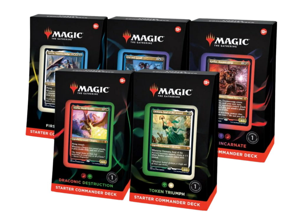 There are all kinds of ways to get started with the growing world of Magic: The Gathering and Commander is definitely a community favorite! Starter Commander Decks are affordable, beginner-focused preconstructed decks that are a great entry-point for any new player looking to get into the format. Each two-color deck includes everything that you’ll need to play and is a great option for game night with your friendsIncludes one of each of the Starter Commander DecksEach Starter Commander Deck set includes: