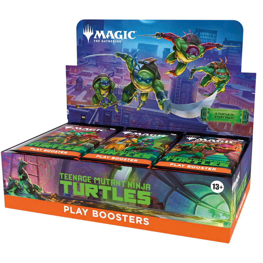 The Teenage Mutant Ninja Turtles – Play Booster Box contains:30 Magic: The Gathering | Teenage Mutant Ninja Turtles Play Booster Packs; each Play Booster Pack contains:• 14 Magic: The Gathering cards• May contain these cards: TMT 1–252; PZA 1–20• 1–5 cards of rarity rare or higher (2: 25%; 3: 3%; 4: <1%)• 2–5 uncommon cards• 6–10 common cards• 1 land card• 1 card of any rarity is traditional foil• Foil borderless mythic rare Turtle in <1% of boosters• Traditional foil land replaces a land in 20% of boosters