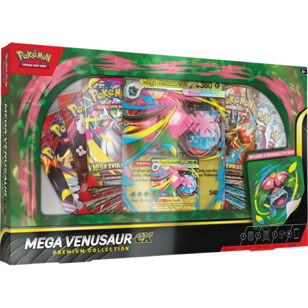 Solar-Powered Smackdowns with Mega Venusaur ex!Keep your Pokémon at full power with help from Mega Venusaur ex! Its Solar Transfer Ability lets you move Grass Energy among your Pokémon as you please, ensuring you’re always ready to attack. In this collection, you get a playable foil promo card and an oversize lenticular promo card featuring Mega Venusaur ex, along with a tech sticker for decorating devices, binders, and notebooks. You’ll find even more Pokémon inside a stack of Pokémon TCG booster packs.The Pokémon TCG: Mega Venusaur ex Premium Collection includes:• 1 foil promo card featuring Mega Venusaur ex• 1 oversize lenticular promo card featuring Mega Venusaur ex• 1 tech sticker featuring Mega Venusaur• 8 Pokémon TCG booster packs