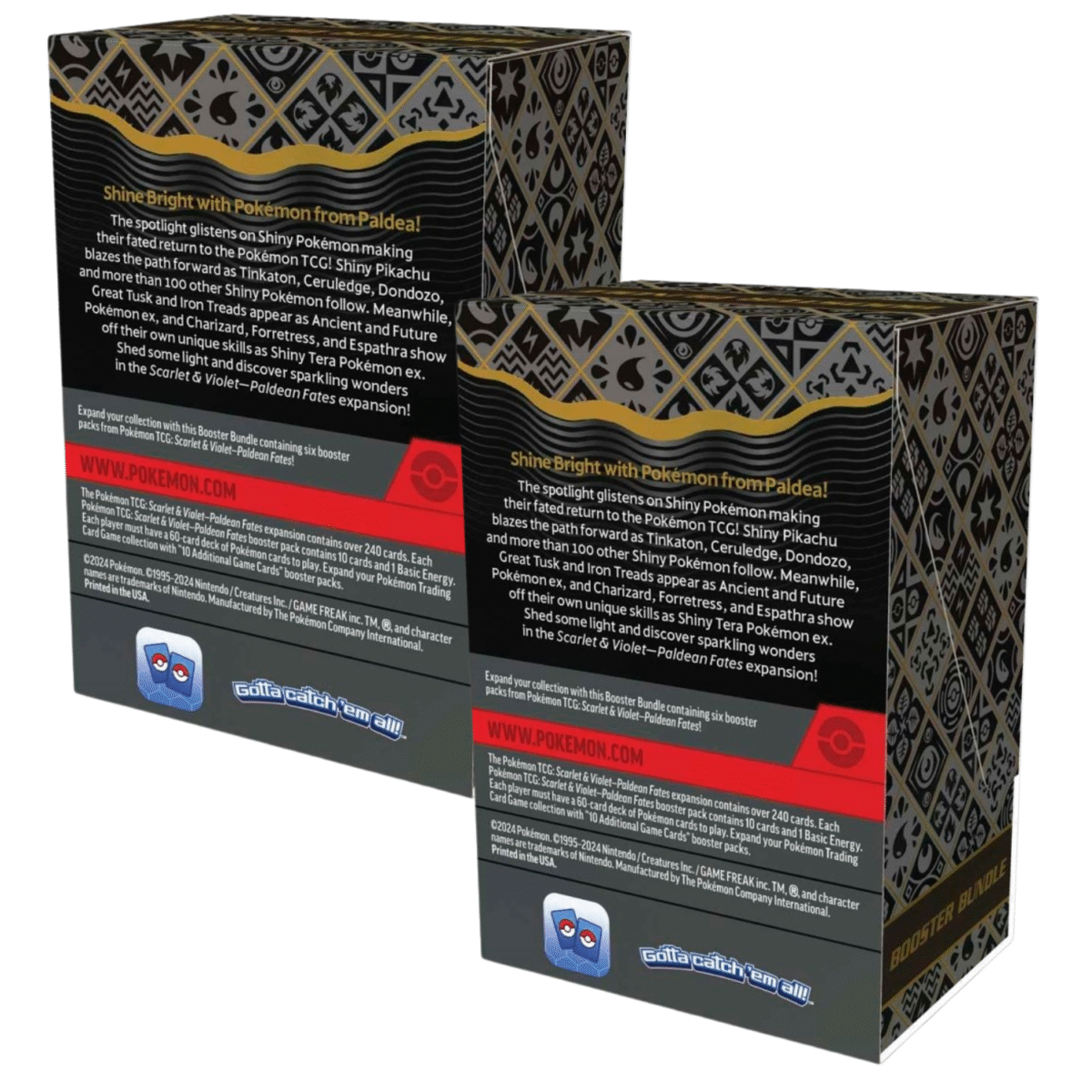Shine Bright with Pokรฉmon from Paldea! The spotlight glistens on Shiny Pokรฉmon making their fated return to the Pokรฉmon TCG! Shiny Pikachu blazes the path forward as Tinkaton, Ceruledge, Dondozo, and more than 100 other Shiny Pokรฉmon follow. Double your excitement with the Pokรฉmon Scarlet & Violet Paldean Fates Booster Bundle (2-Pack). This set includes a total of twelve booster packs (six in each booster bundle) from the Paldean Fates expansion, providing a thrilling opportunity to expand your collection and discover unique cards.