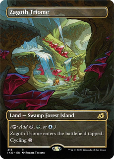 (T: Add B, G, or U.) Zagoth Triome enters the battlefield tapped.Cycling 3 Rarity:R #:313 Card Type:Land — Swamp Forest Island Artist:Robbie Trevino